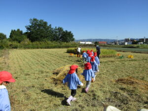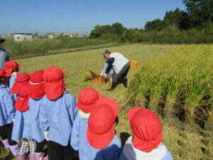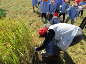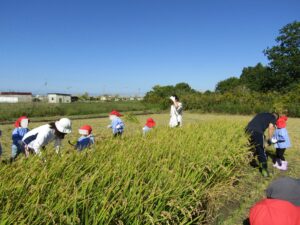 6月に田植えした稲が収穫期を迎え、西信達くねあの園児たちと稲刈りを行いました。